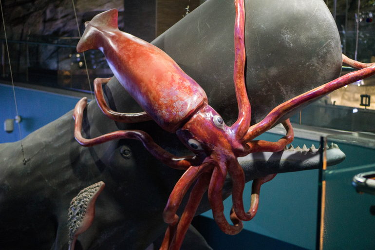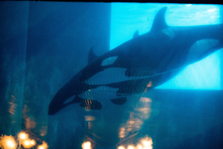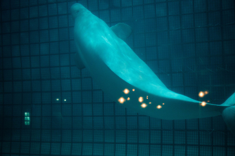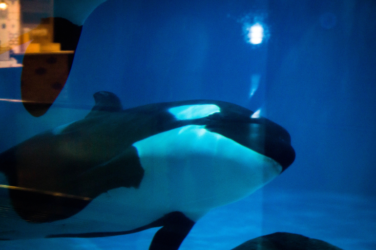 Рядом с пираньями лестница к косаткам, белухам и дельфинам. Мы решили сразу их посмотреть. Народу там тоже не было особо, 1 семья стояла и все. Дельфины далеко за сеткой носились с огромной скоростью, думаю они такой стаей раздолбили бы стекло. Белуха стояла на месте и смотрела на дельфинов.