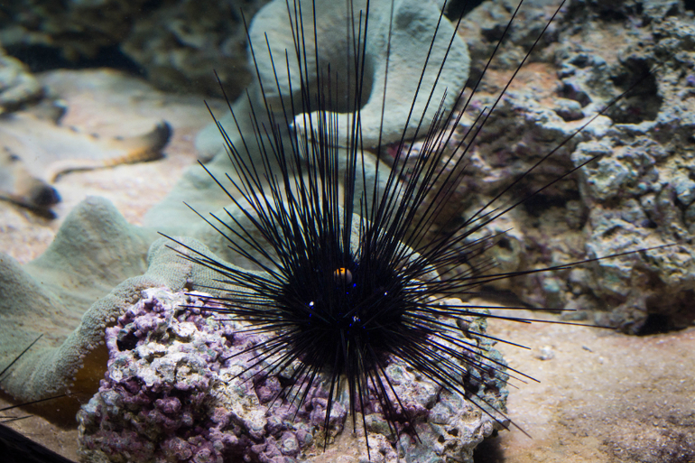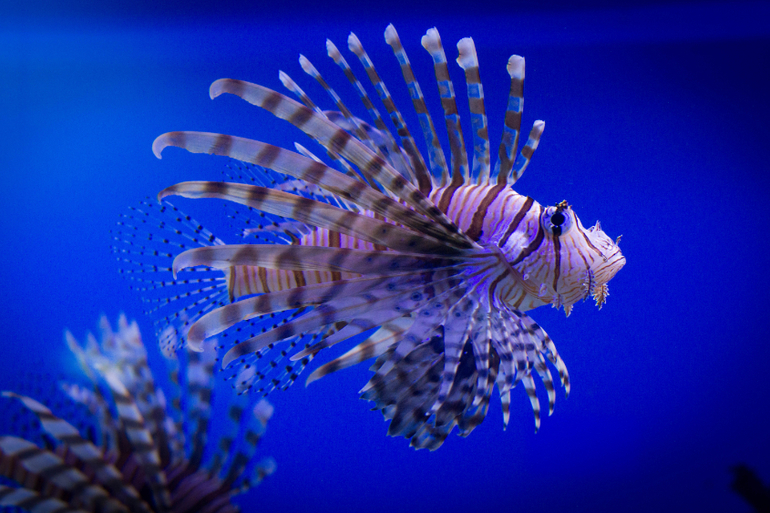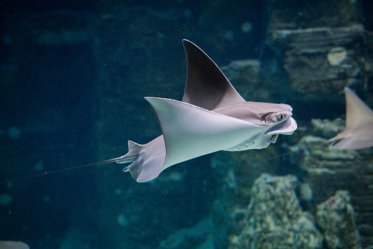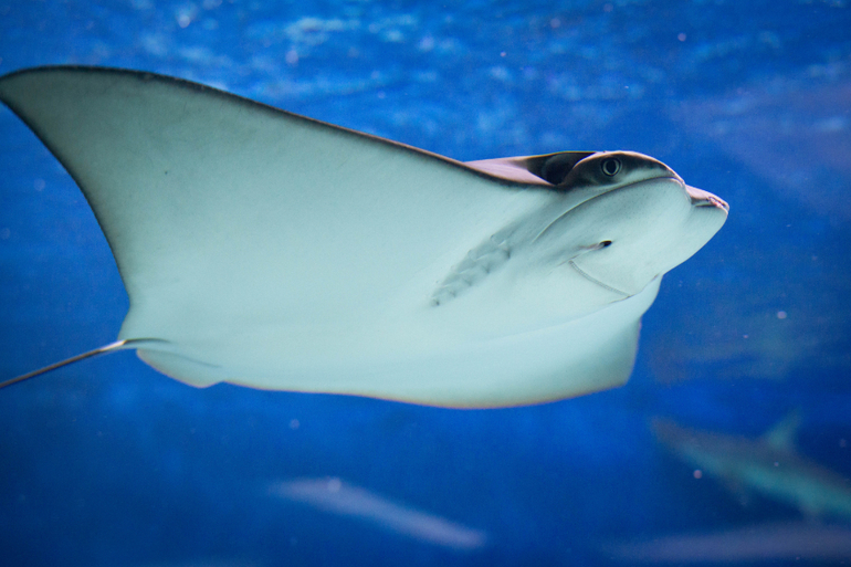 Дальше стояли тетушки, проверяющие билеты и турникеты. Экспозиция открывается скатами, играет приятная музыка (саундтреки из фильма "1+1") и скаты "пархающие" словно бабочки под водой, все очень умиротворяло. Людей человек 10-15, которые тут же разбрелись по разным аквариумам и мы совершенно спокойно все смотрели и фотографировали.