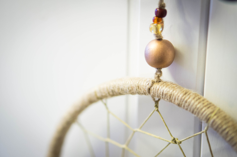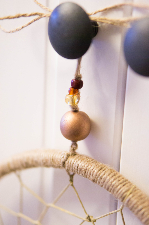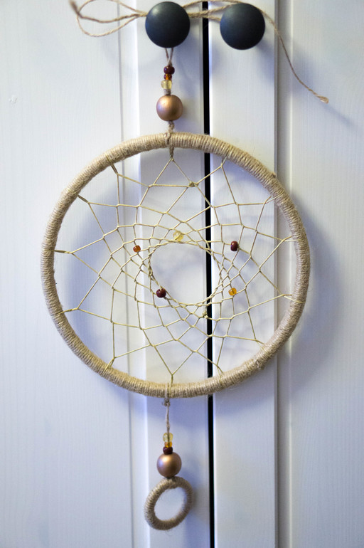 Ивовых веточек у меня не было, использовала для круга старые деревянные пяльцы, обмотала бечевкой, а для плетения использовала вощеный шнур и чешские бисерины и деревянные бусины.