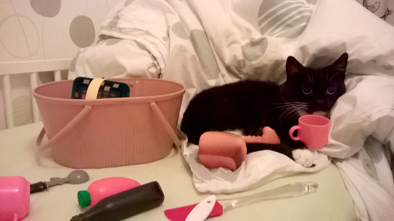После еды, вылезая из-за стола, или получив вкусняшку, он всегда говорит спасибо. Если пролил или намусорил - вытирает за собой и выбрасывает мусор. Очень любит кошку и все пытается её накормить. Иногда относит ей коробку корма и тычет в нос, иногда устраивает ей "чаепития" и даёт еду с собственной кухни. Расстраивается, почему же киса не хочет есть)