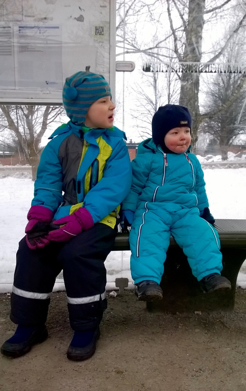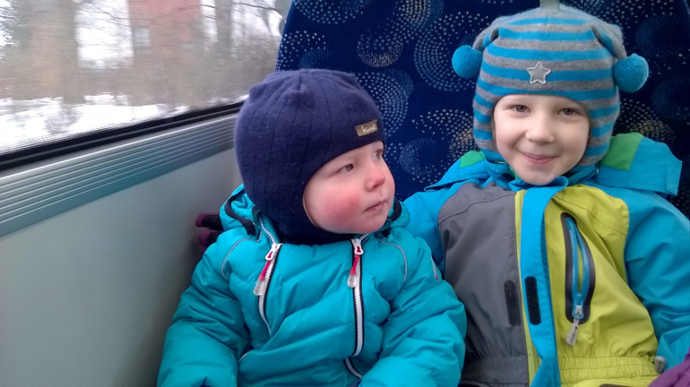 Пару раз мы с детьми ездили на автобусе без коляски, один раз даже с пересадкой. В первый раз Лео был в полном восторге. Он с удовольствием ждал автобус на остановке вместе с Лукой, всматриваясь в даль. В автобусе же он хочет сидеть только рядом с Лукой, но позволяет мне иногда придерживать его, чтоб не свалился на поворотах и при торможении.