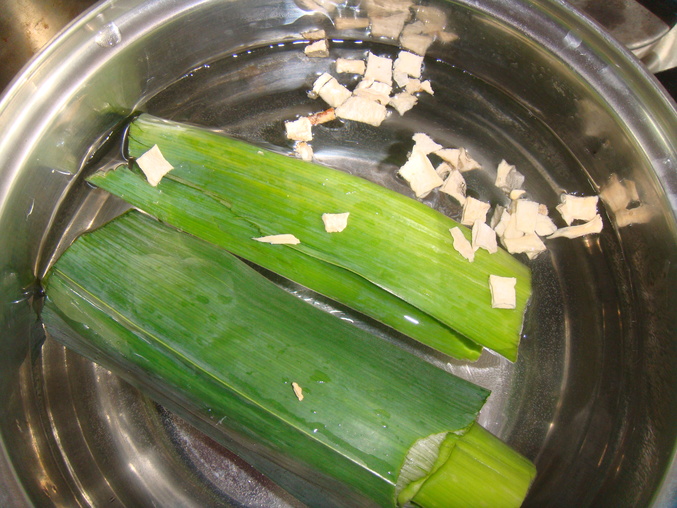 В кастрюлю с холодной водой положить зеленую часть лука-порея и корень петрушки. Поставить на огонь: