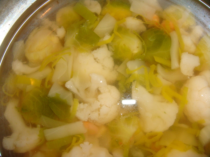После закипания проварить 5 минут и вытащить лук. Всыпать в суп нарезанную белокочанную капусту. Через 3-5 минут цветную и брюссельскую капусту, нарезанный порей: