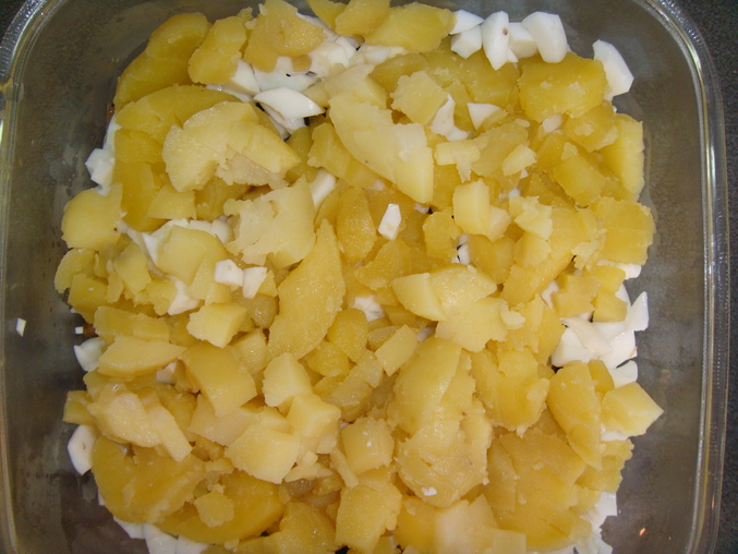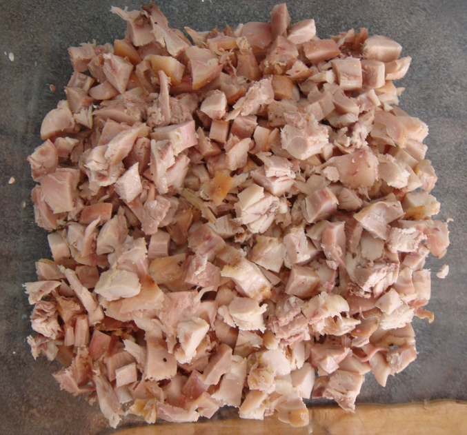 Куриную грудку (отварную, тушеную или жареную без кожи) нарезать на кубики: