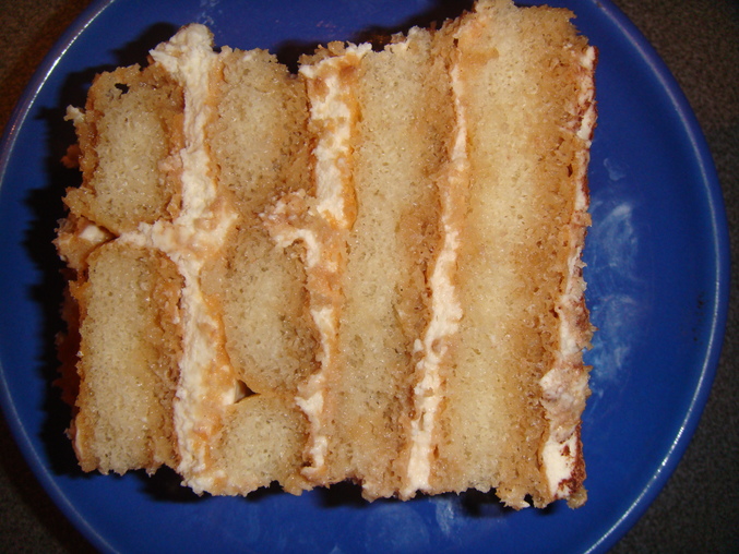 Остается только собрать торт. Макнуть печенье в кофейную смесь, уложить в форму. И так целый слой печенья вплотную, затем залить кремом и уложить следующий слой: