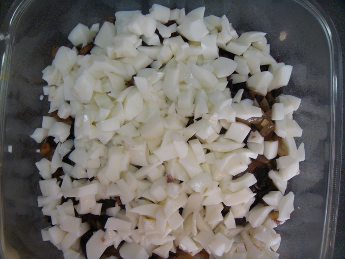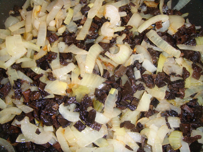 Отварить до готовности, мелко порубить и обжарить на растительном масле вместе с луком:
