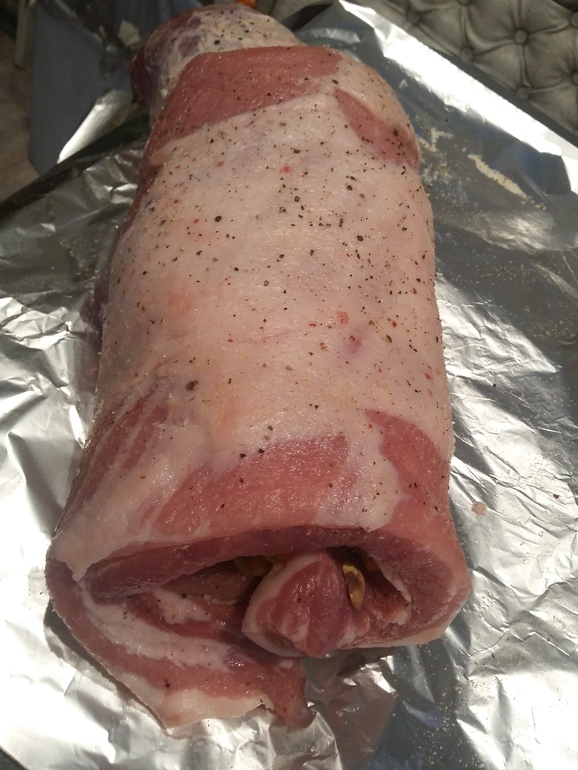 Свиную пашину разложить на столе. Посолить, поперчить, посыпать чесночным порошком: