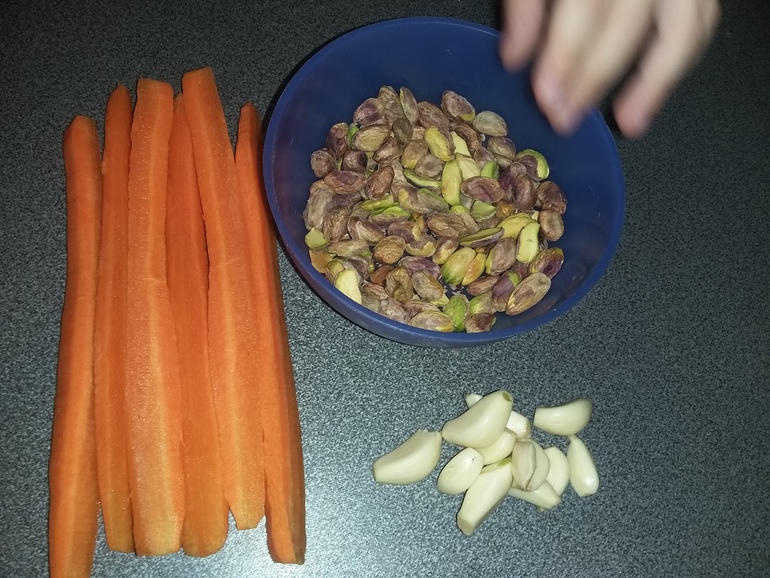 Приготовить бруски сырой моркови, фисташки и чеснок: