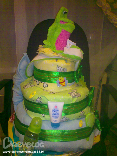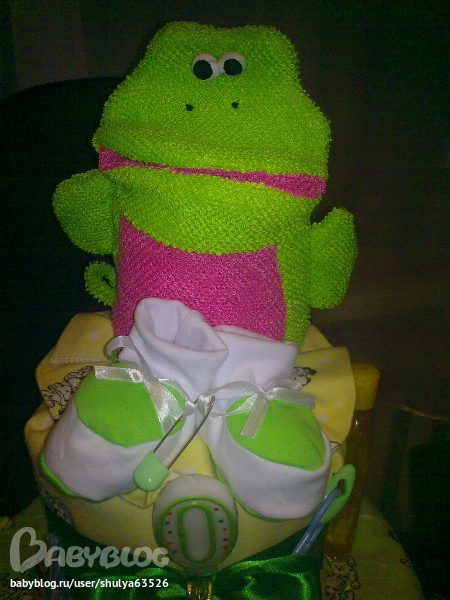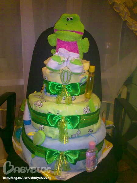 на сколько вышел тортик.... полотенце - 620р, две байковые пеленки по 200р., подгузы 92шт - 620р, штанишки 80р, 3 пачки влажных салфеток (они в нутри второго яруса) по 120р, вся остальная фигля-мигля на 800р. Итого - почти 3000. Ещё здесь не хватает открытки и папки для свидетельства о рождении от