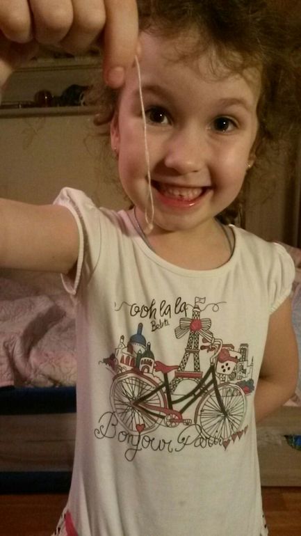 Последние пару месяцев у нас превратились в постоянное ожожидание, когда же выпадет первый зуб )))). Ульяна даже шатала самый податливый, но он не поддавался. И тут вчера зуб здал свои позиции и стал сильно шататься. Ульяна с папой быстренько привязали к нему нитку и вырвали. Кто был больше рад, папа или Ульяна не понятно ))))