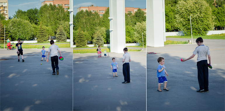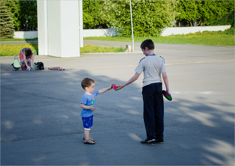 Люблю, когда он начинает играть с ребятами постарше. Такие ребята разговаривают с ним. Ему очень интересно. Правда, детки постарше не всегда принимают малышей. Исключения есть всегда.