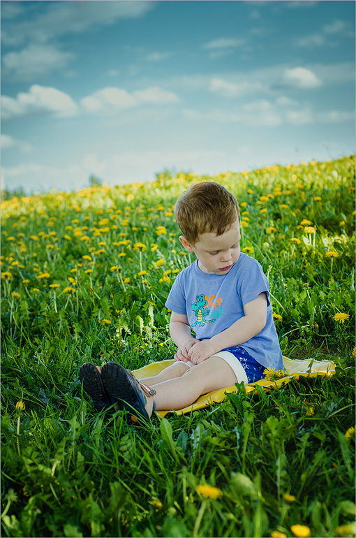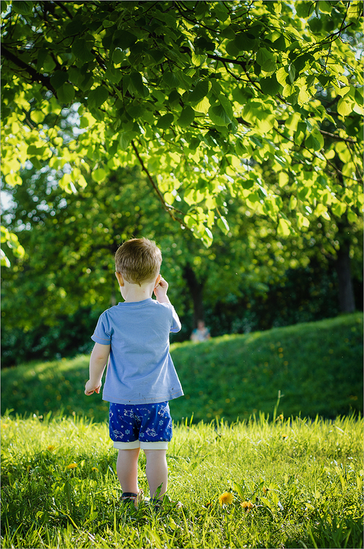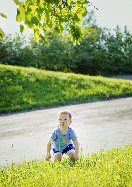 Тимуру всё интересно. Небо голубое, луна на небе том, пчёлы, осы, жучки и паучки, горки и холмы, камни, червяки, одуванчики, колючая крапива и мягкая ёлка.