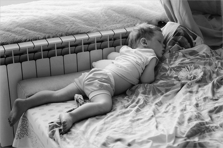 Тимур держался, не засыпал. Но заходя в подъезд, я увидела спящего Тимура. Фразы «Супчик покушаем, пойдём буль-буль» не помогли. Он открывал и снова закрывал глаза. Думаю, начну доставать из коляски, он проснётся. А он прижался, пискнул и спать. На диване устроился «поудобнее» и продолжил спать. Так и спит в грязной одежде, неумытый ребёнок.