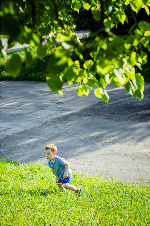 Мальчик, лет 7, бегает по холмам в одиночестве. Тимур за ним по пятам. Тот быстро с очень крутого спуска сбегает и забирается на другой холм, Тимур заглядывается и с опаской поглядывает вниз. Спускается потихоньку. Мальчику нравиться, на него смотрят. Так и знакомство происходит. Активные игры продолжаются, я с коляской не успеваю за ними. Как же быстро он бегает! Убежал, а из-за холма и не видно его. Приходиться поторапливаться.