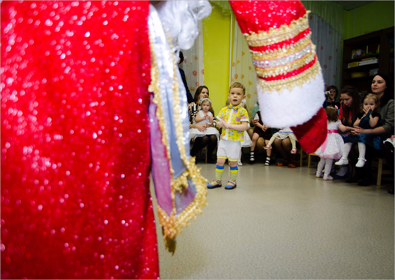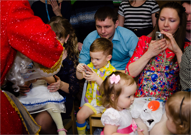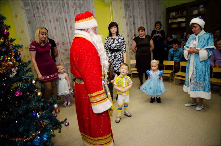 Внимательно смотрел на снегурочку, пытаясь повторить танцевальные движения. Не все движения запомнил, пропускал занятия. Хлопал постоянно в ладошки, отвлекался на ёлку. А уж когда появился дед мороз глаз с него не сводил, на месте не сидел, к нему подходил. Завороженным взглядом на него смотрел! Стишок, наверно хотел рассказать, да подарок получить!