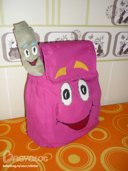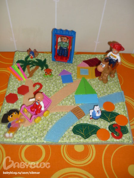 Дочка очень рада подаркам от мамы. Картой можно играть, планирую ее использовать при обучении счету, можно давать какие-нибудь задания, чтобы спасти мишку или фею, катать машинку, играть в ролевые игры. Используем с картой фигурки и элементы Лего дупло, игрушки из киндеров, аппликации (даша - силиконовая или резиновая аппликация, купленная в магазине рукоделия по 30 руб), набор учись считать. К сожалению игрушек с героями мультфильма в России практически нет. Летом поедем в Украину, надеюсь закупиться там игрухами. Рюкзак (Каринка уже собрала побелку в подъезде на рюкзак) и карта Даши-путешественницы, карта отсюда