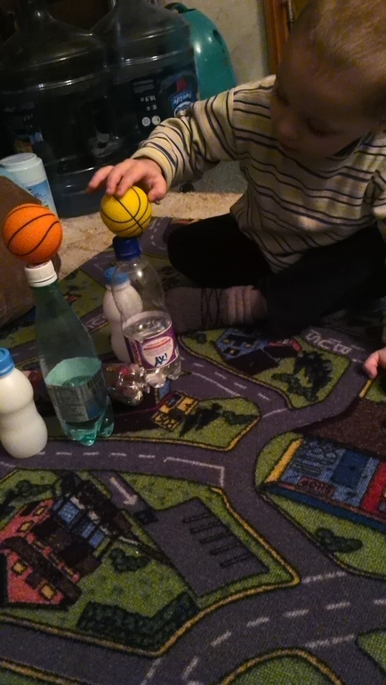 1. Играли в боулинг впервые, катить мячик у Сани совсем не получается, а когда бросает, то этот мяч во все стороны летит, и в основном в стекло, поэтому поиграть долго не получилось. Саня придумал другую игру, посадить мячик в домик, на бутылку, ох и не простое это дело.