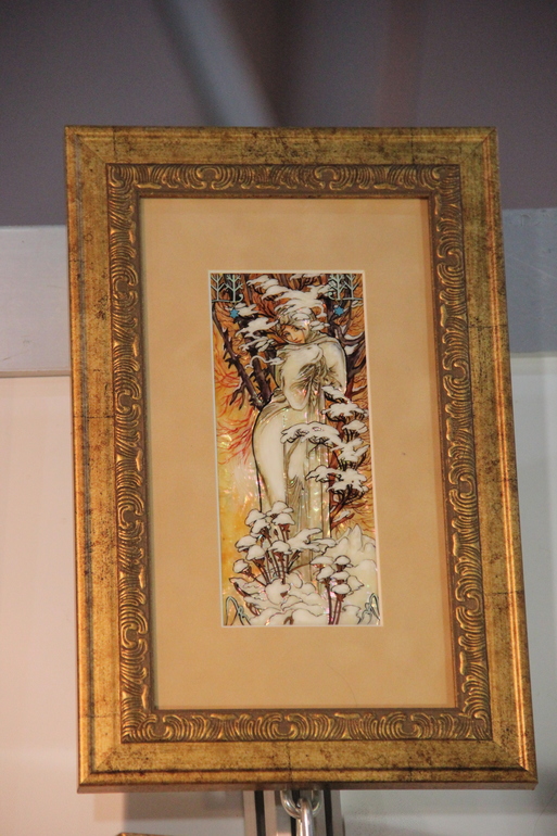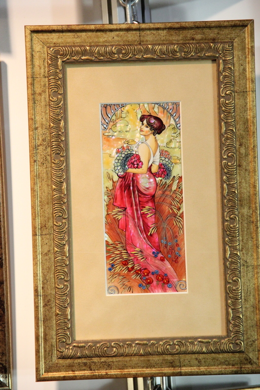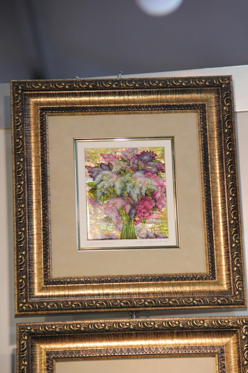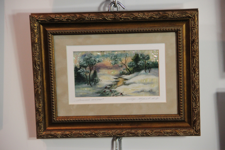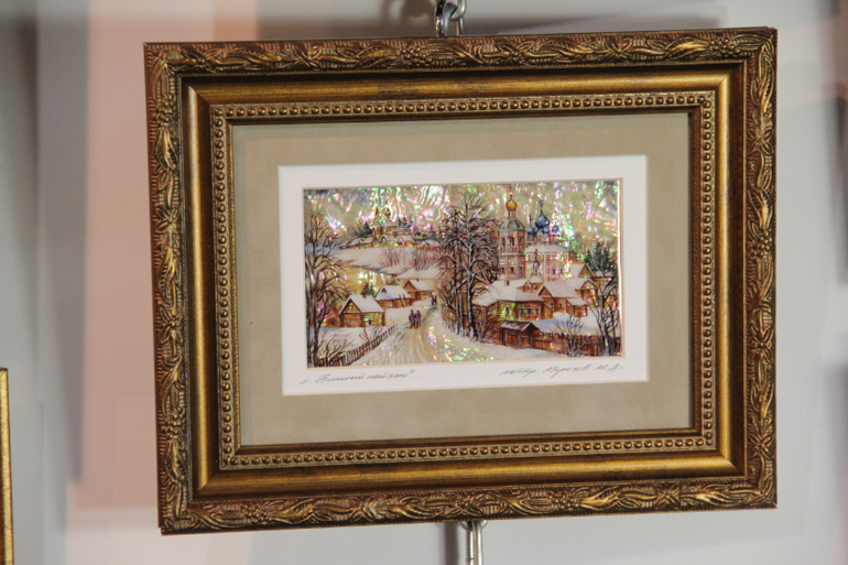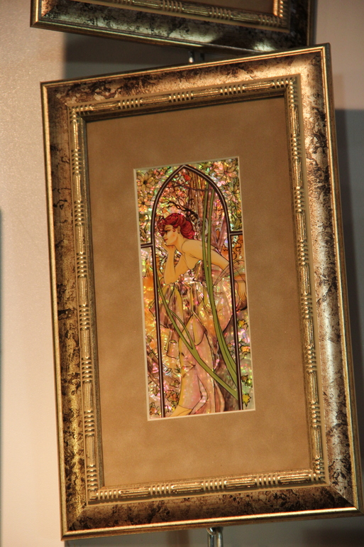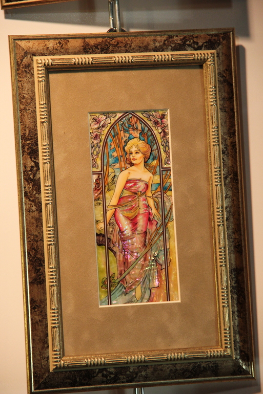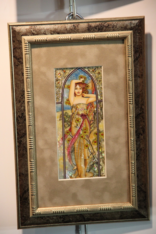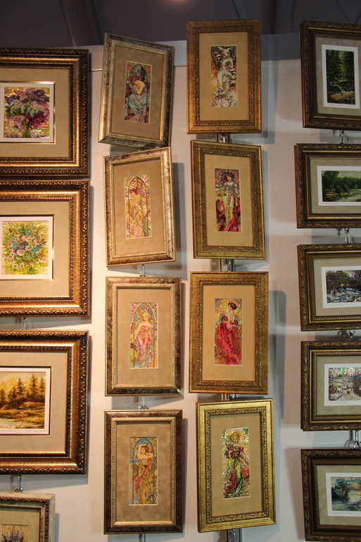 И последнее, что я успела посмотреть, это роспись по перламутру. Мужчины курировали стенд. Название не записала. Там были шкатулки, картины и украшения. Меня более всего заинтересовали картины - очень эффектно смотрятся даже банальные сюжеты типа лес-озеро-лодочка. А работы по мотивам картин Альфонса Мухи - просто чудо. Кому понравятся, пишите Михаилу - maikl-65@mail.ru.