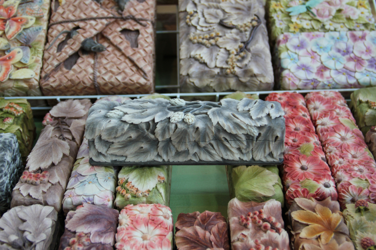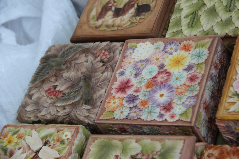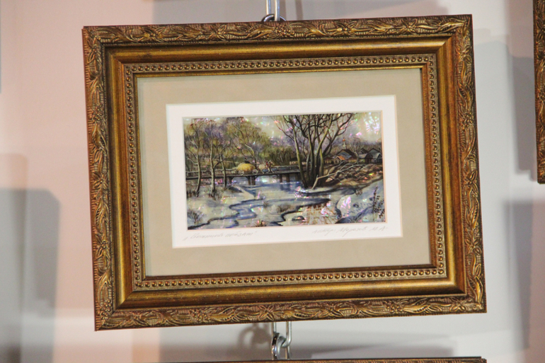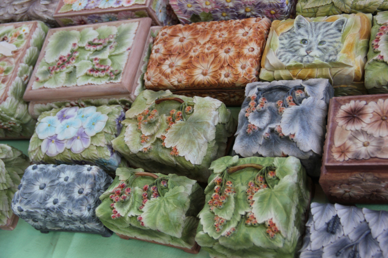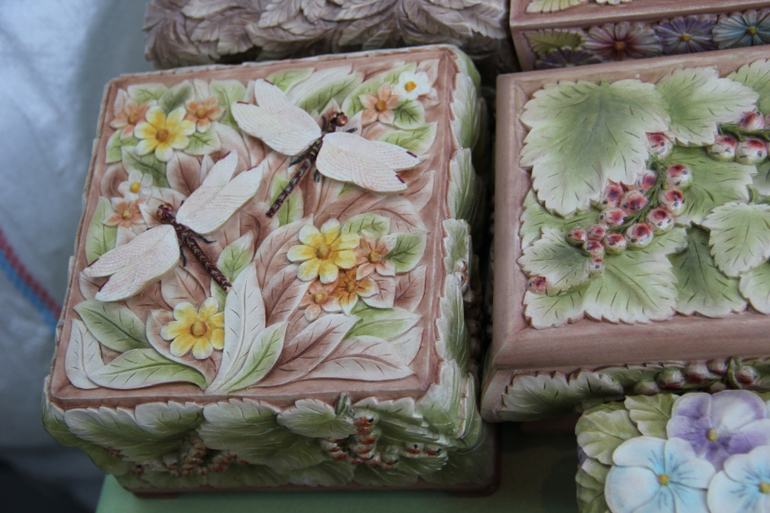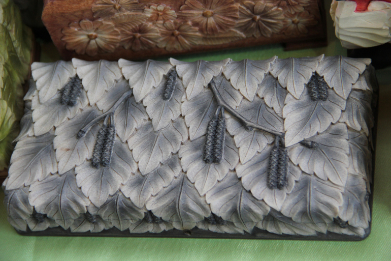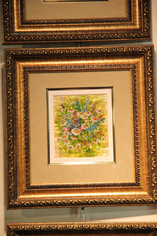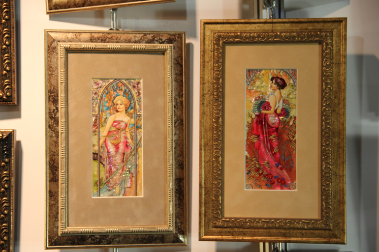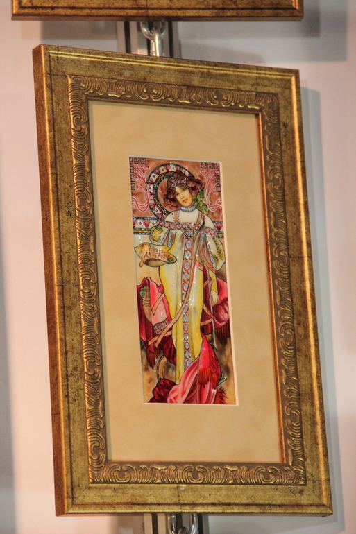 И последнее, что я успела посмотреть, это роспись по перламутру. Мужчины курировали стенд. Название не записала. Там были шкатулки, картины и украшения. Меня более всего заинтересовали картины - очень эффектно смотрятся даже банальные сюжеты типа лес-озеро-лодочка. А работы по мотивам картин Альфонса Мухи - просто чудо. Кому понравятся, пишите Михаилу - maikl-65@mail.ru.