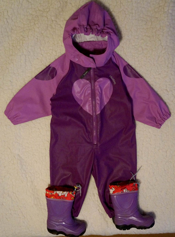 Очень теплый, "не убиваемый". Утеплитель Изософт и флисовая подкладка. Попа и колени усилены тканью. Состояние отличное, гуляли одну зиму (верхней одежды много, не заношен).