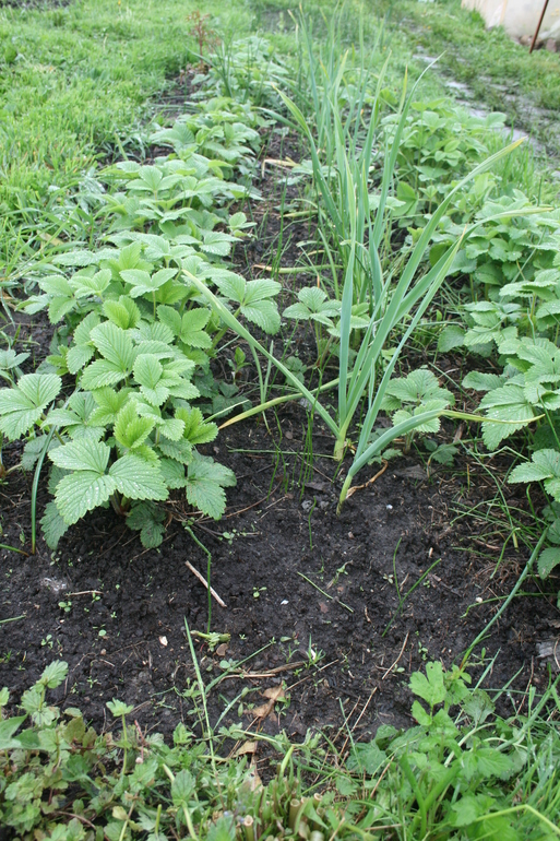 17 мая. Слегка примороженный чеснок все-таки выжил и получился весьма крупным (он растет вместе с клубникой, защищает ее от вредителей)