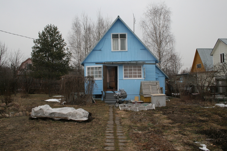 Большую часть засеяли газоном, кусочек выделили под огород, ну и домик покрасили в небесно-голубой.