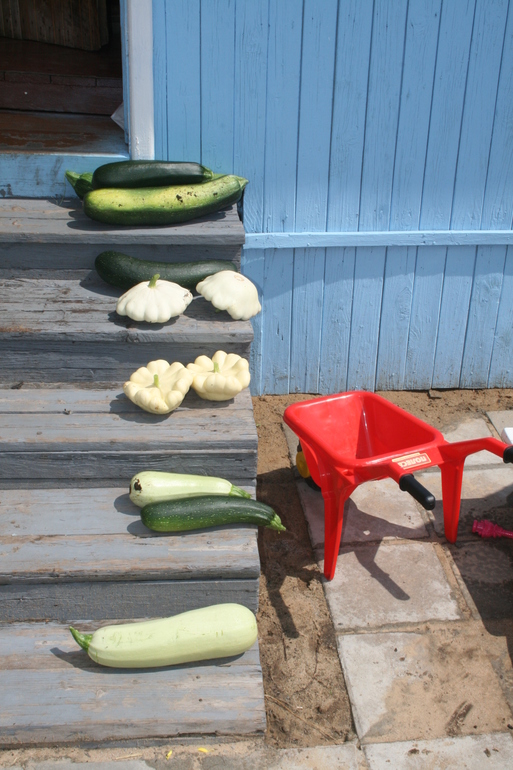 В начале июля кабачки и патиссоны вовсю плодоносили, у соседей еще ничего не было или только начиналось.