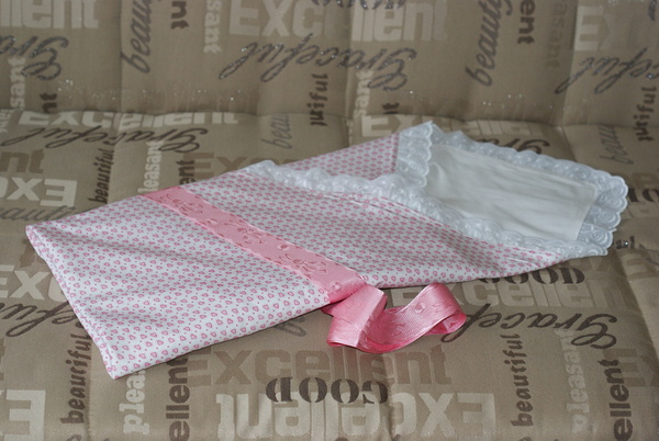 Кроме того ,что хотелось сделать что то своими руками для дочи меня останавливала цена на конверты для выписки , а дешевые все какие то страшненькие или утепленные . В общем сшила из трикотажной пеленки + белый сатин + шитье . И еще ленточка очень нравится - на ней очень милые зайки )))))