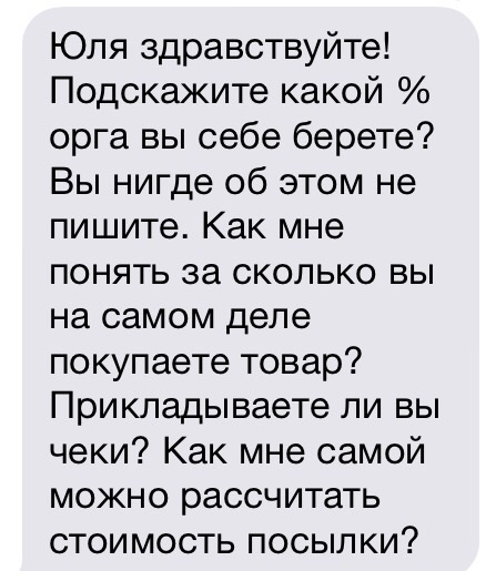 Обычно на такие вопросы я отвечаю орг 10-15%. Но по факту орг я иногда вообще не беру и заказчик порой об этом даже не знает. Ваши заказы - это не работа для меня. Я не зарабатываю на закупках. Мой "орг" может составить 64 цента. Я не высчитываю орг при заказе. Часто я оставляю себе лишь какую-то сдачу, мелочь, на которую мой ребенок покупает себе конфету или карандаши. Кто-то серьезно считает, что я занимаюсь этим ради заработка в 2 евро 78 центов? Прошу прощения за откровение, но с деньгами у нас здесь всё в порядке.