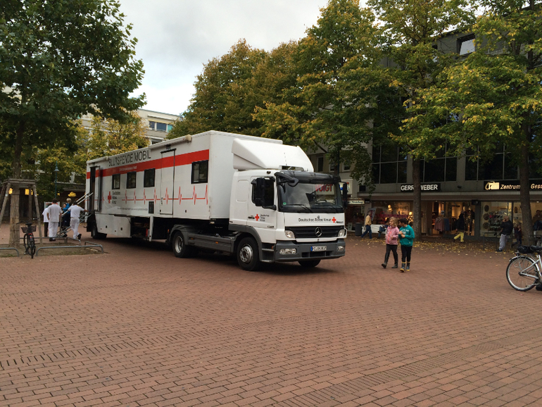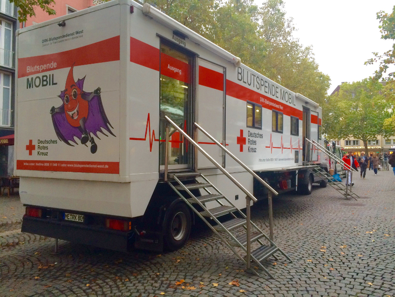 Машины от Красного Креста 5 раз в месяц стоят на разных улицах Бонна и ждут всех желающих сдать донорскую кровь.