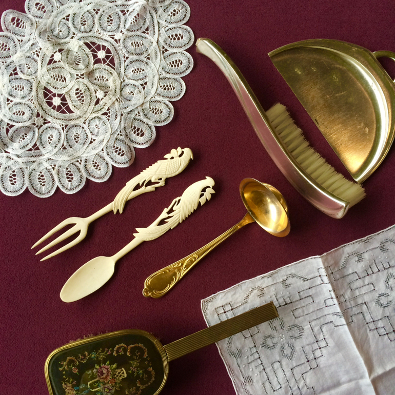 Я тоже любитель антиквариата, завидую. Совок и щеточка у нас на рынке не менее 20 евро, а то и 50. Соусник клевый. А вот по поводу салфеток, надо смотреть можно и не отстирать. По поводу чужих вещей, это предрассудки. Мне очень приятно пользоваться вещами с историей. Если после дедов остается что то, никто ведь не выкидывает, а даже оставляют на память. Вымыл, почистил и пользуйся. Клевые вещицы!!!!