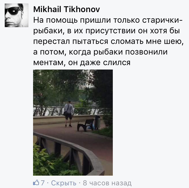 Да. Она занималась бегом, потом остановилась поупражняться на площадке, где отдыхали папа с дочкой после первой волны негатива от психа. И тут все завертелось. Она спряталась у рыбаков, вызвала полицию. Потом помогла папе с дочкой обработать раны. Теперь ходит в парк с баллончиком. Страшно. И я с того случая в парк морально не могу пока зайти. Временно, конечно, но... Осадок тяжелый. Особенно после рассказа знакомой и ее фото(