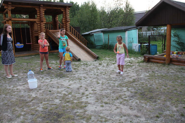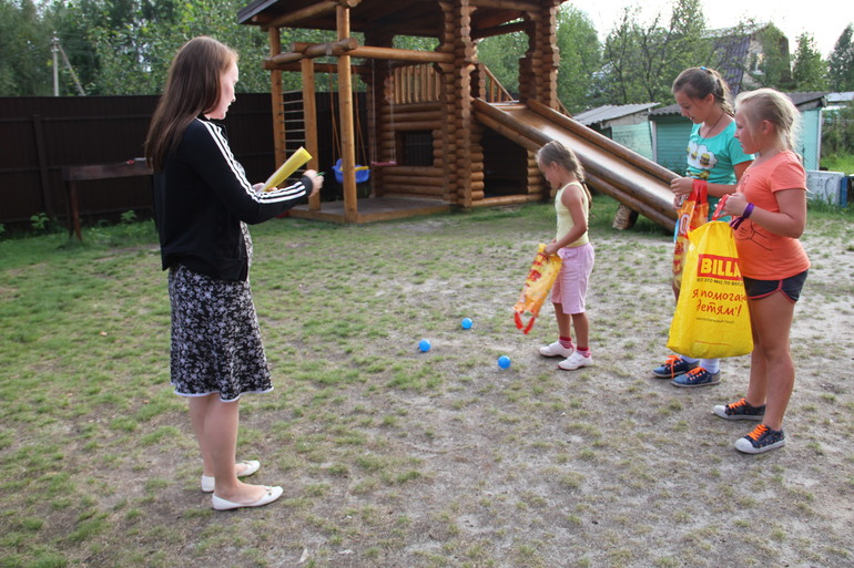1 задание: мы спрятали на всем участке 25 пластиковых шариков, дали каждому пакет и отправили на время их искать.