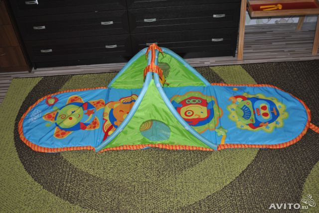 В комплекте три мягкие шуршащие игрушки. Хранить коврик очень удобно - в сложенном состоянии застегивается на пуговицы. Части коврика поднимаются и фиксируются на липучки, получается как палатка, которая защищает от сквозняков.