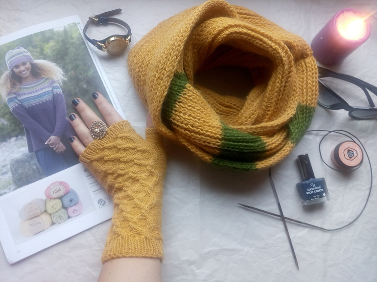 Лето польское весьма загадочное...готовлюсь к осени из того что осталось решила связать шарфики шапки и митенки.Митенки -моя любовь...Шарф-снуд еще не завершен,а митенки готовы.