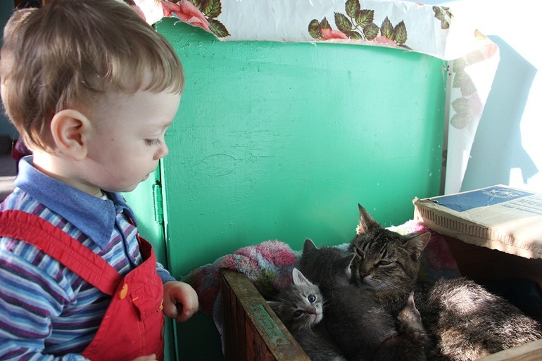 У врача дома(а в станице все так просто, взял и заглянул в нерабочее время, на чаек, да и осмотр заодно). У врача дома оказались кот, кошка и четверо котят. Малышня моя так и прильнула к коробке, Коляська от восторгу вообще какие то непонятные звуки издавал визго-рычательно-хохотательные. Еще бы котят он видел в первый раз, да и кошку так близко)) Ну а Варя просто вдоволь натискала хвостатых друзей. Вот немного фотографий из гостей