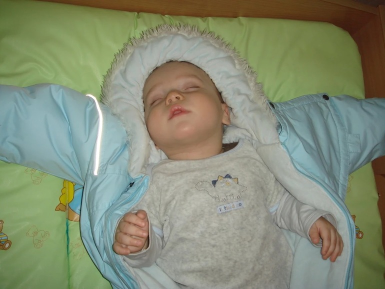 Так вот, вернувшись домой со спящем ребенком, мне надо было с него снять куртку, полукомбинезон, свитер, боди, колготки, памперс. А, ботинки еще конечно! И одеть памперс сухой и слип, т.к. дома не топят. Ну и хочу заметить, миссия была выполнена успешно! Вот он! Спящий без задних ног ребёнок!))