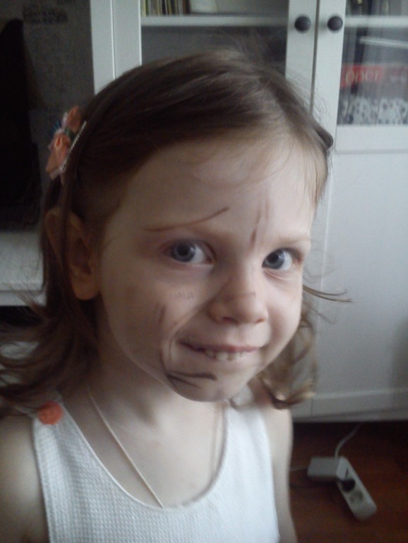 Дружить предпочитает с мальчишками, палки, камни, беготня и всякого рода шалости - наше всё. От чего локти и колени постоянно в ссадинах.
