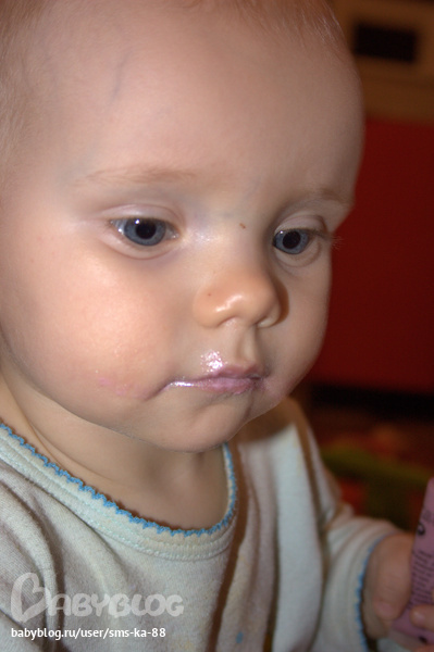 Сама не ходит, только с опорой. Зато как прыгает!!! Подходит к кроватке, держится за неё и скачет! Сама кушает ложкой), конечно это не полноценный приём пищи, но что-то в рот да и попадает)))