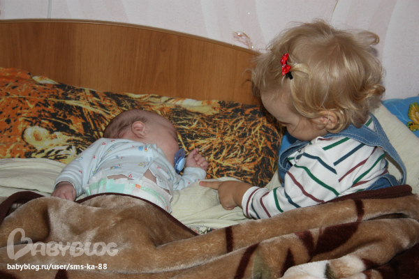 Алина так няньчилась с Глебом! Катя пошла его укладывать, а через некоторое время зовёт меня...а там Алина залезла под плед к Глебу, держит ему соску, гладит и поёт баю-бай! Глядя на это я окончательно поняла что нужен 2 ребёнок!))) Я то уже задумываюсь и хочу, а вот муж говорит что не готов пока....