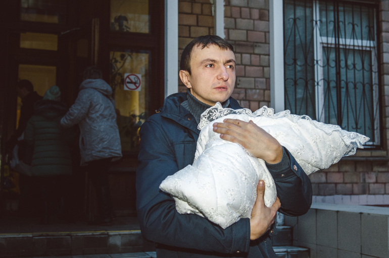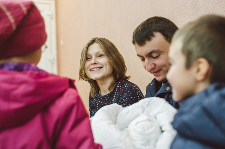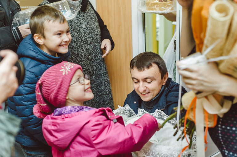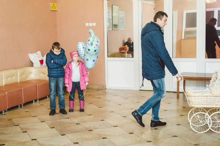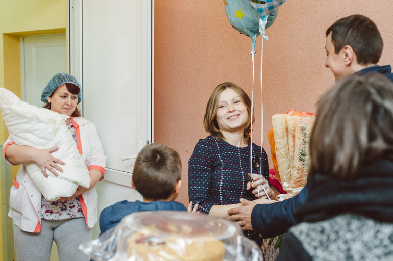 Наконец, двери открываются, появляется мама и медсестра с большим белым конвертом! Начинается беспорядочное броуновское движение из взрослых и детей. Дети наперегонки бегут к маме, взрослые тоже, все хотят обнять и поцеловать. Цветы и торты в руках, они нужны для поздравления и вручения, но очень мешают И в этой каше еще замешаны четыре фотографа (мы с Лешей и двое роддомовских), которые хотят снять красивые кадры, но успеть за передвижениями просто не реально. Радостная суматоха кружит вокруг мамы, а медсестра с огромной улыбкой и с белым конвертом пока стоит одиноко в дверном проеме и наблюдает за всей этой катавасией!