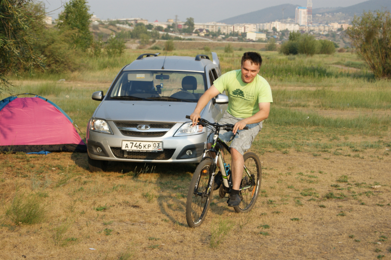 шуточно называю эту фотографию "мои три коня" (автомобиль, муж и велосипед)