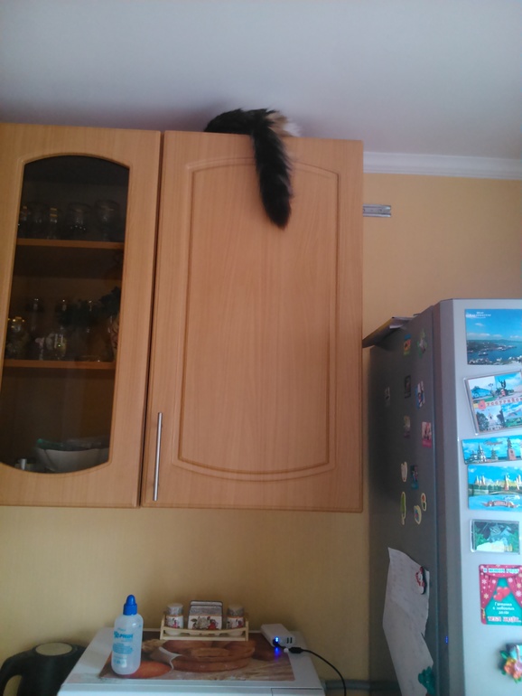 Спит на холодильнике или на шкафах... Уже сколько раз ее дверями прижимала...Вообще не люблю кошек, шерсть везде и всюду... Зато мышей нет..