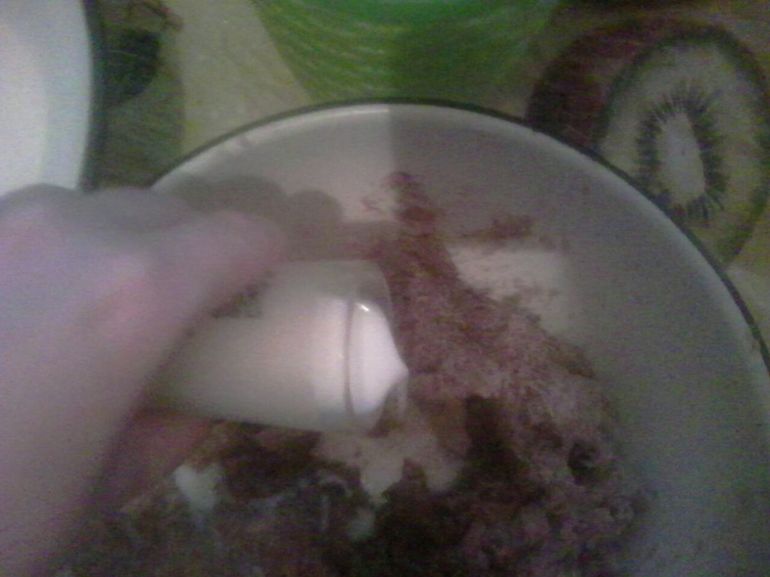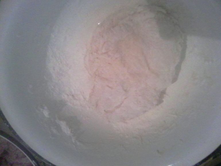 Хорошо разболтать жидкость, подгребая с краев миски муку.