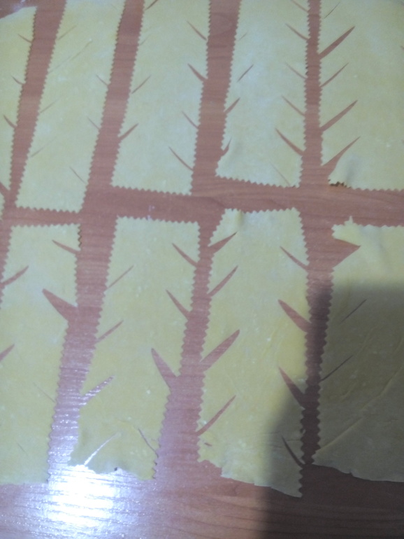 Далее разделить его на 2 части. Из каждой части раскатать тонкий сочень, разрезать его на полоски, шириной примерно 4-5 см, длиной примерно 20 см, сделать "елочку".