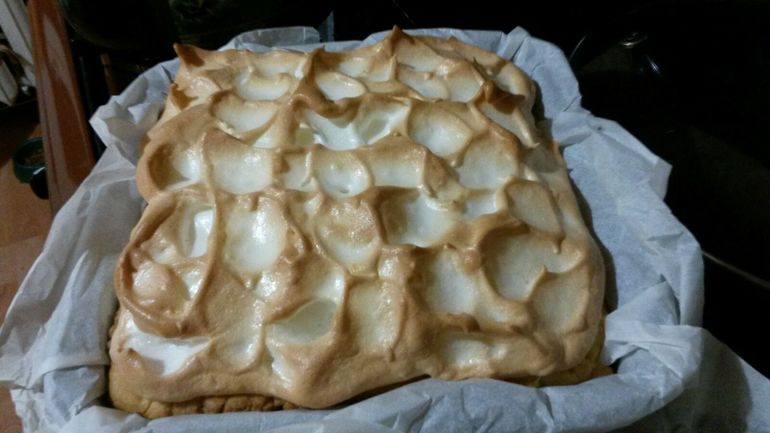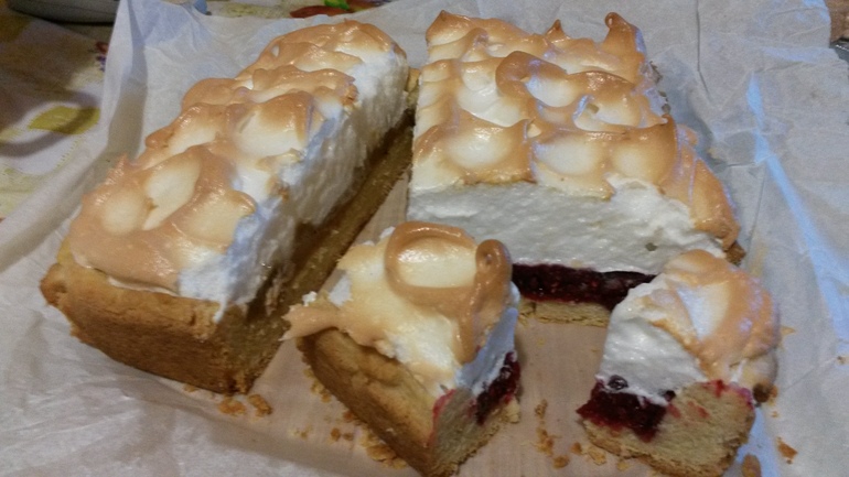 Когда тесто уже зарумянится, сверху выкладываем белки, у меня получился толстый слой, я выкладывала и на начинку и на сами бортики. Ложкой можно сделать волны или на что хватит фантазии!