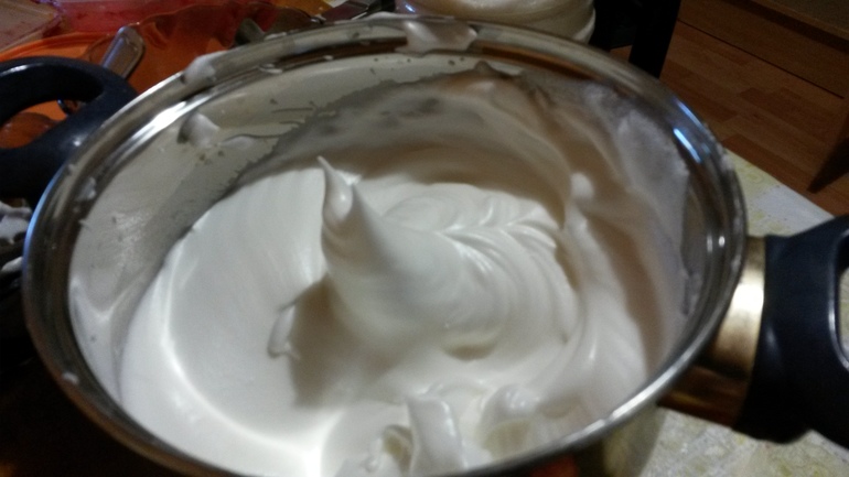 Взбить миксером холодные яичные белки, постепенно добавляя в них сахар. В конце вылить ложку лимонного сока. Меренга получается плотной и хорошо держит форму.