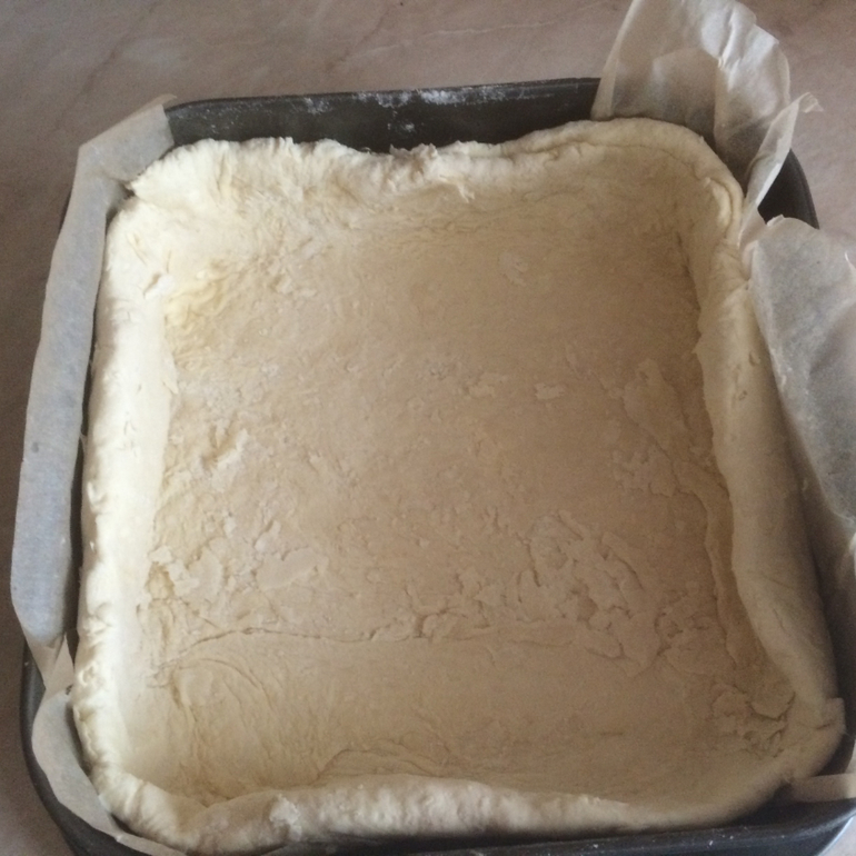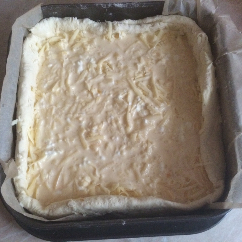 Тесто раскатать под форму (форма с бортами) пирог немного поднимается. Укладываем тесто - на тесто выкладываем лук, посыпаем сыром и заливаем смесью из яйца и сметаны.