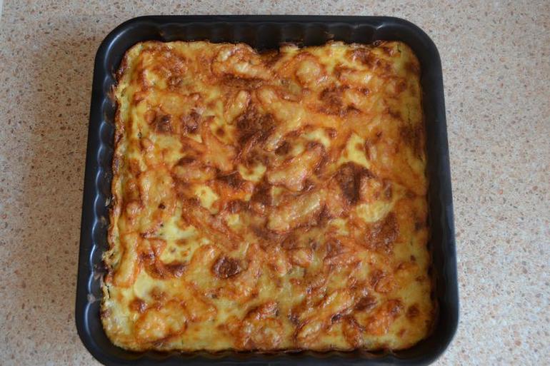 Картофель - 1,3 кг Фарш говяжий - 500 г Лук репчатый - 2 шт. Масло растительное - 1 ст. л. Лавровый лист - 1 шт. Сметана - 4 ст. л. Сыр твёрдый тёртый - 150 г Перец чёрный молотый - по вкусу Масло сливочное для смазки формы - 1 ч. л. Соль - по вкусу Приготовление: 1. Чистим картофель. 2. Ставим отваривать его до готовности в подсоленной воде с лавровым листом. 3. Тем временем обжариваем на растительном масле нарезанный лук. 4. Как только лук станет прозрачным, добавляем к нему мясной фарш, солим и перчим по вкусу. 5. Жарим до готовности мяса. 6. К этому времени должен свариться картофель. Вынимаем лавровый лист и разминаем картофель толкушкой в грубое пюре. 7. Половину полученного пюре выкладываем в форму для запекания, предварительно смазанную сливочным маслом. Слой должен получиться ровным и плотным. 8. Затем выкладываем фарш с луком. 9. И сверху закрываем оставшимся картофелем. Разравниваем ложкой или лопаточкой. 10. Сверху намазываем сметаной. 11. Посыпаем тёртым сыром. И ставим в духовку на 180 градусов примерно на 40 минут. 12. За это время запеканка должна основательно прогреться изнутри и поджариться сверху. 13. Разделяем на порции и подаём горячей. Сметана, кетчуп или майонез в данном случае - идеальные соусы.