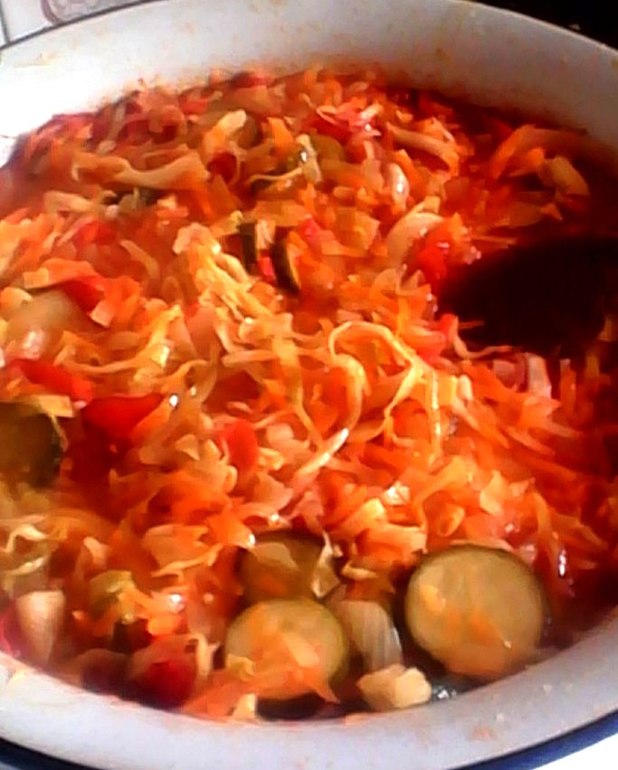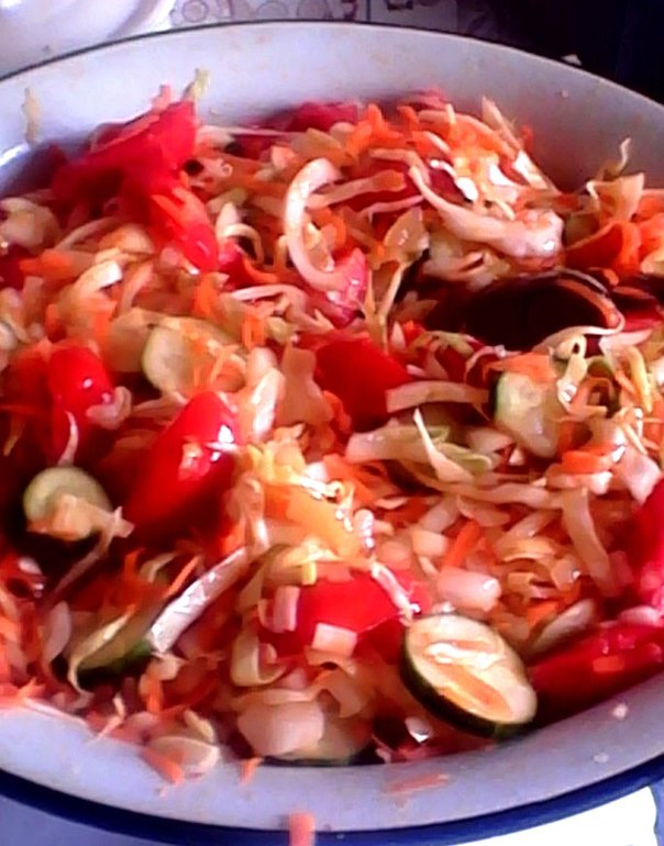Режем все овощи в одну посуду- я в тазу делаю. Капусту-шинкую, огурцы- колечками, морковь-на терке, помидоры на 4 части, лук- кубиком.